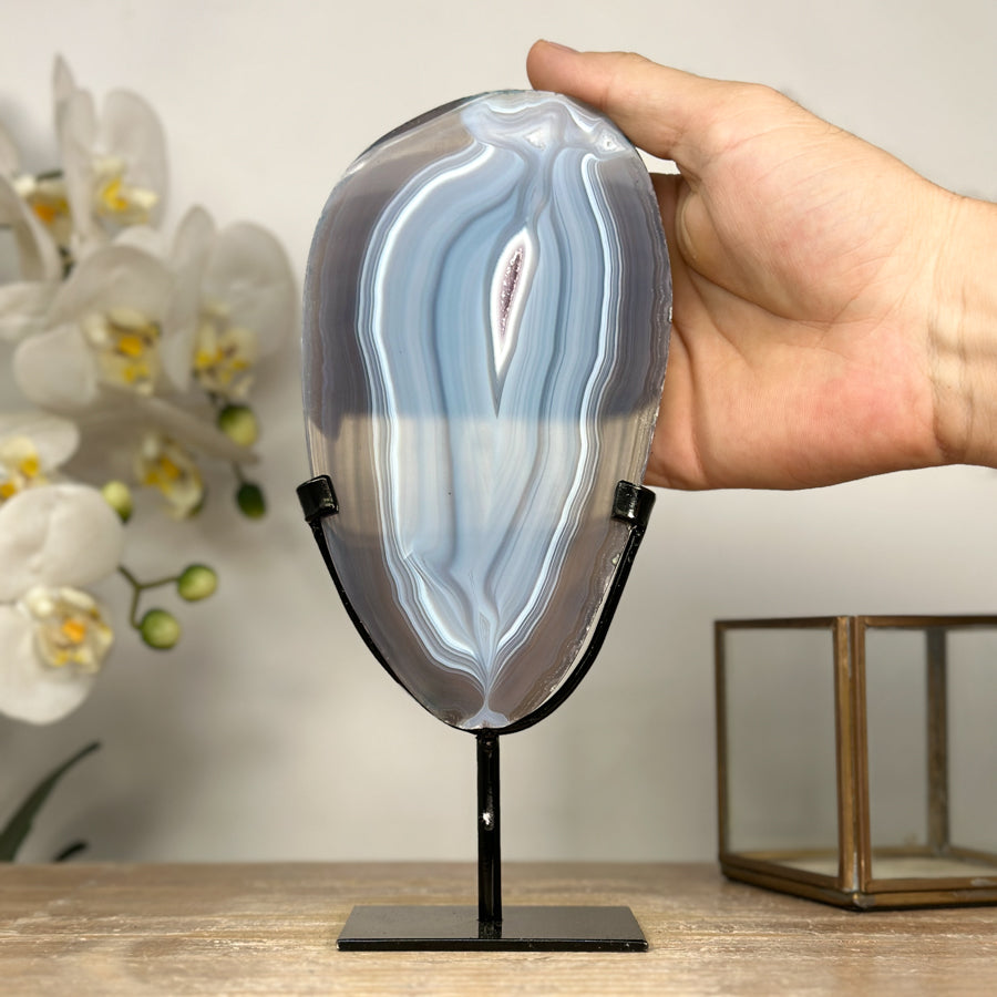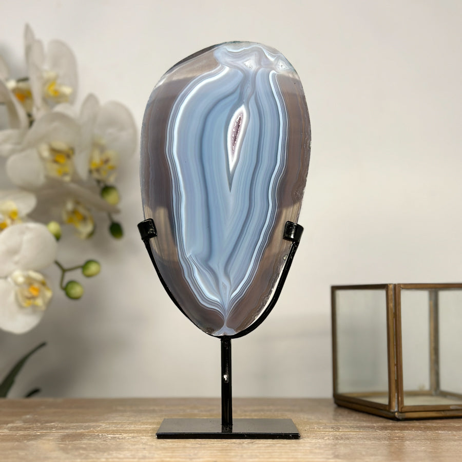 Decorative Blue Agate & Quartz Slice with Metal Base – Natural Polished Stone from Uruguay - MWS2009