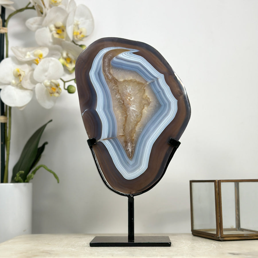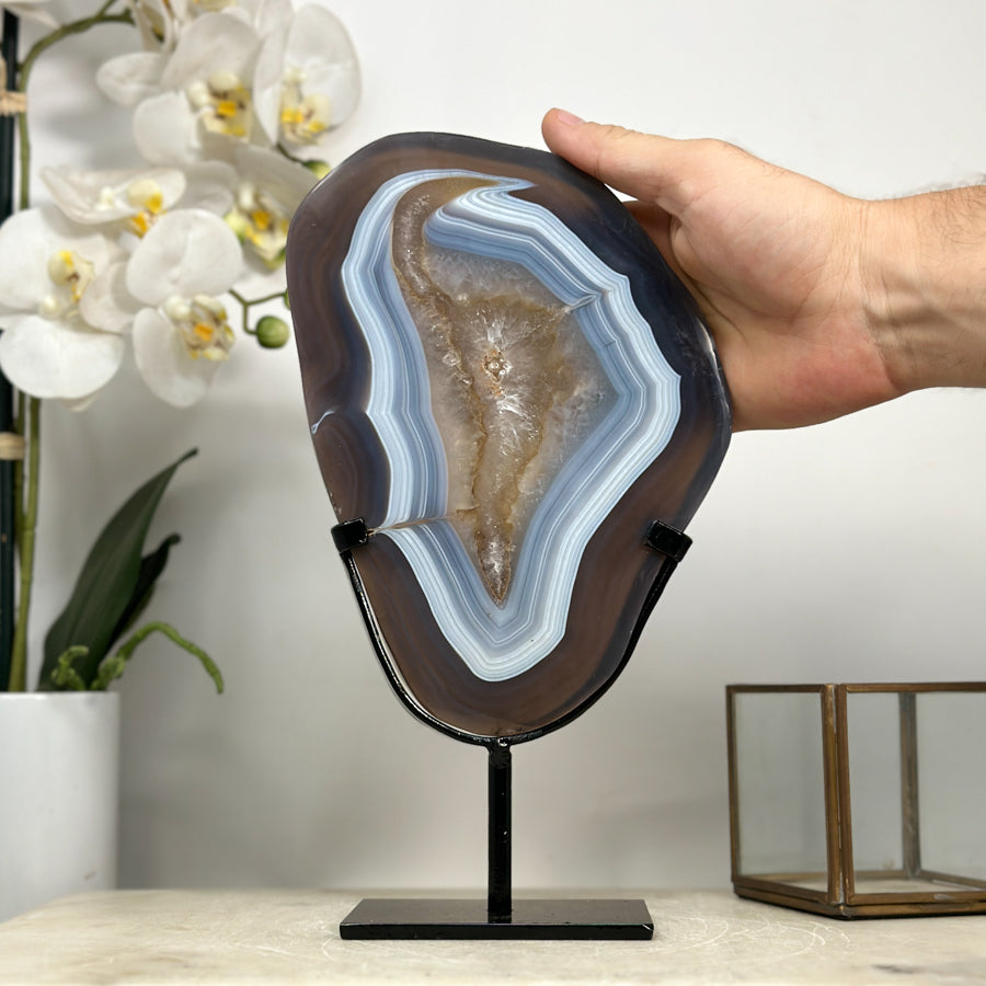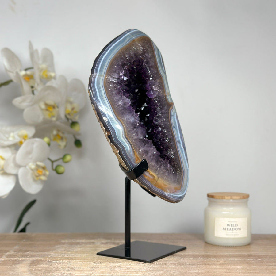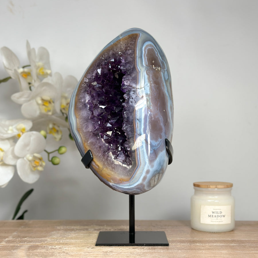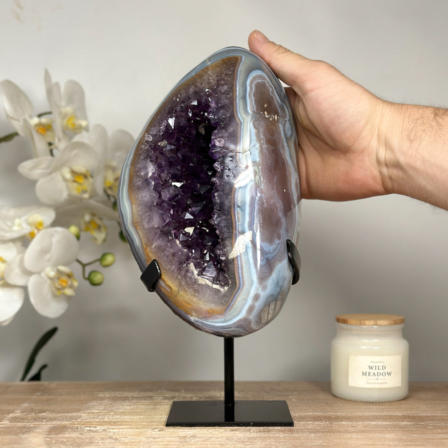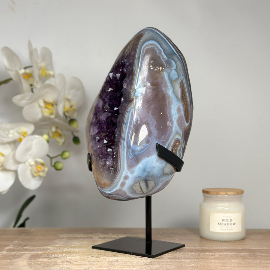 Natural Blue Banded Agate & Amethyst Geode, Metallic Stand Included - MWS1695