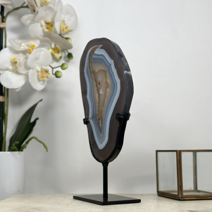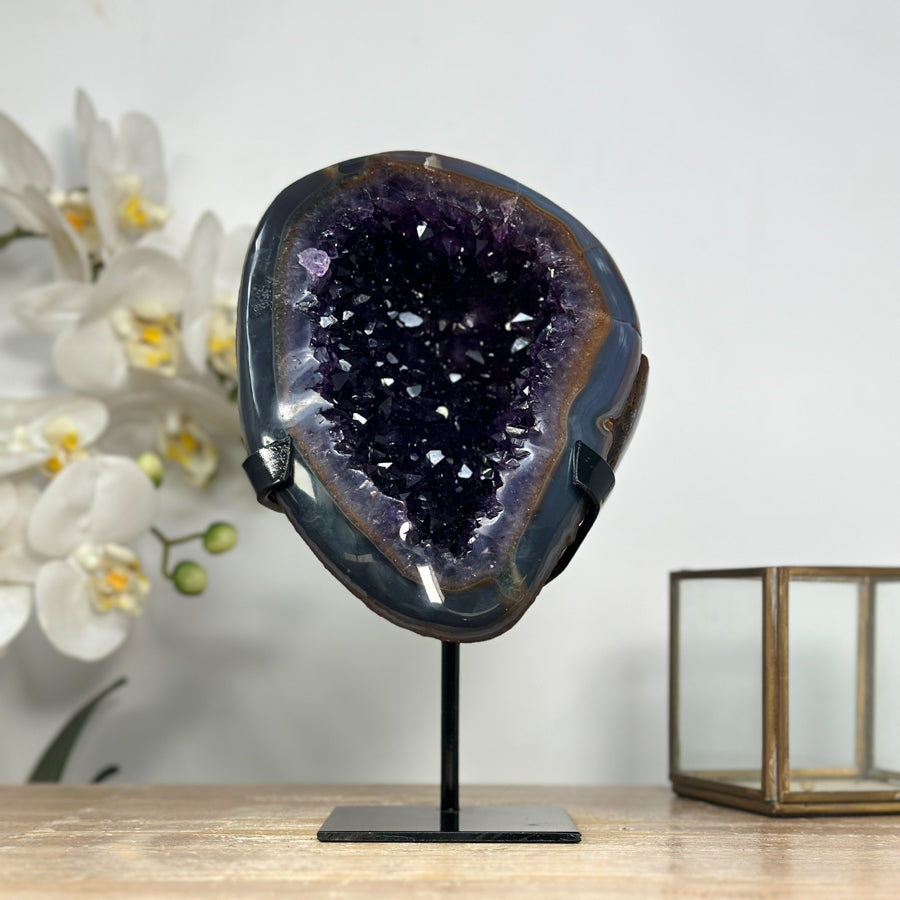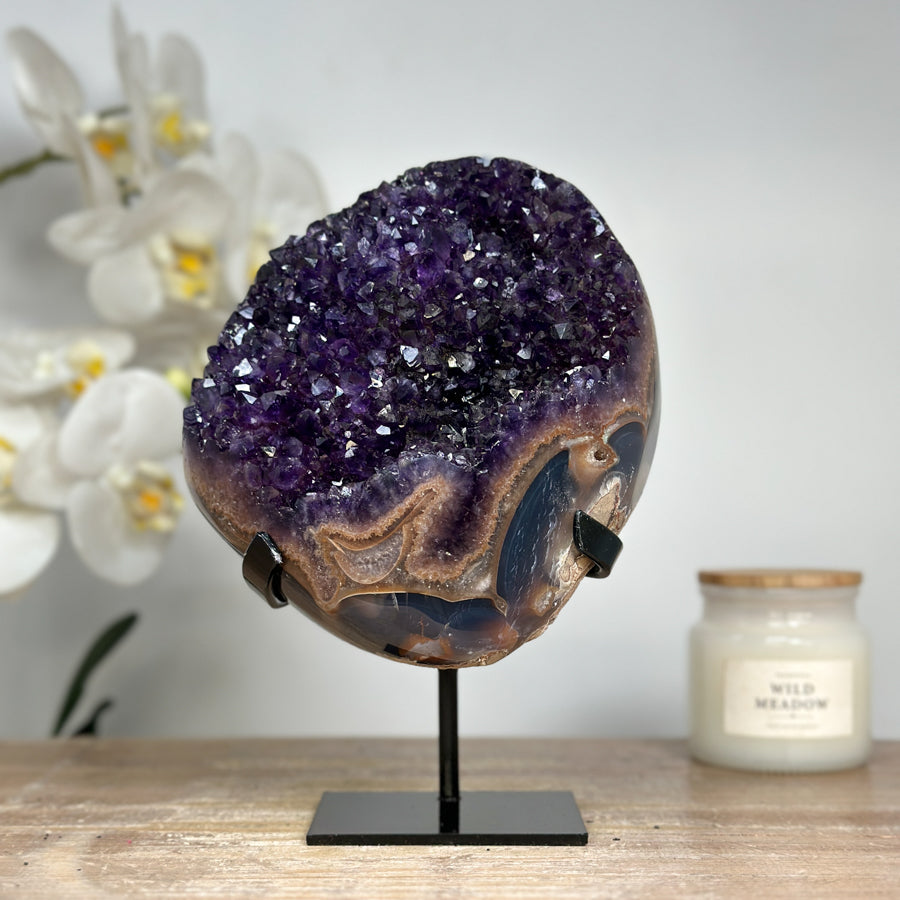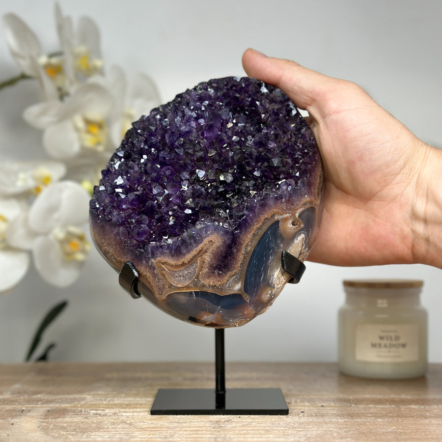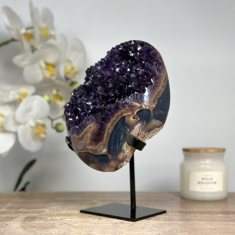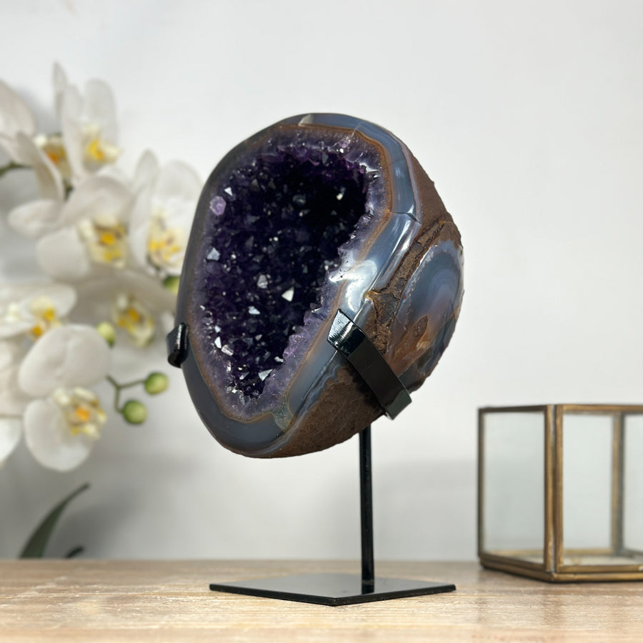 Natural Blue Banded Agate & Amethyst Geode, Metallic Stand Included - MWS1695