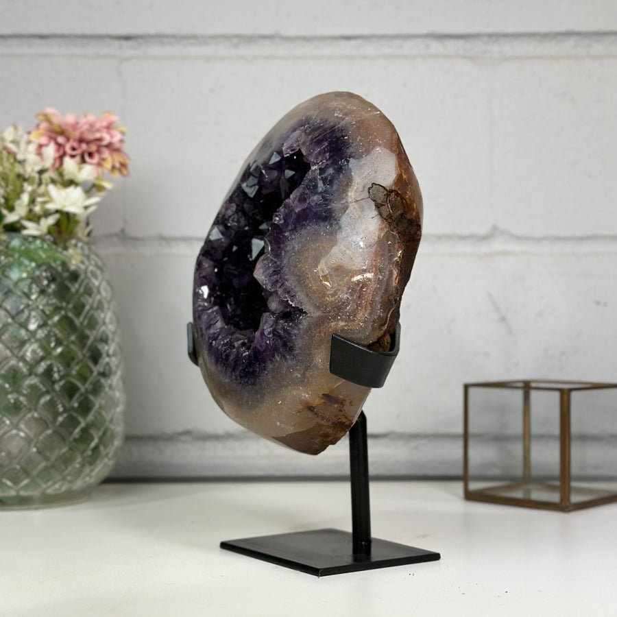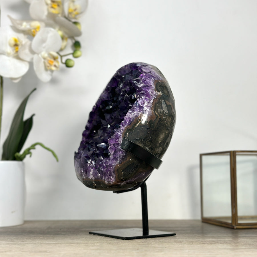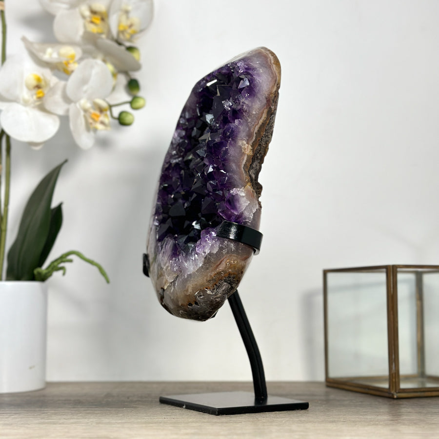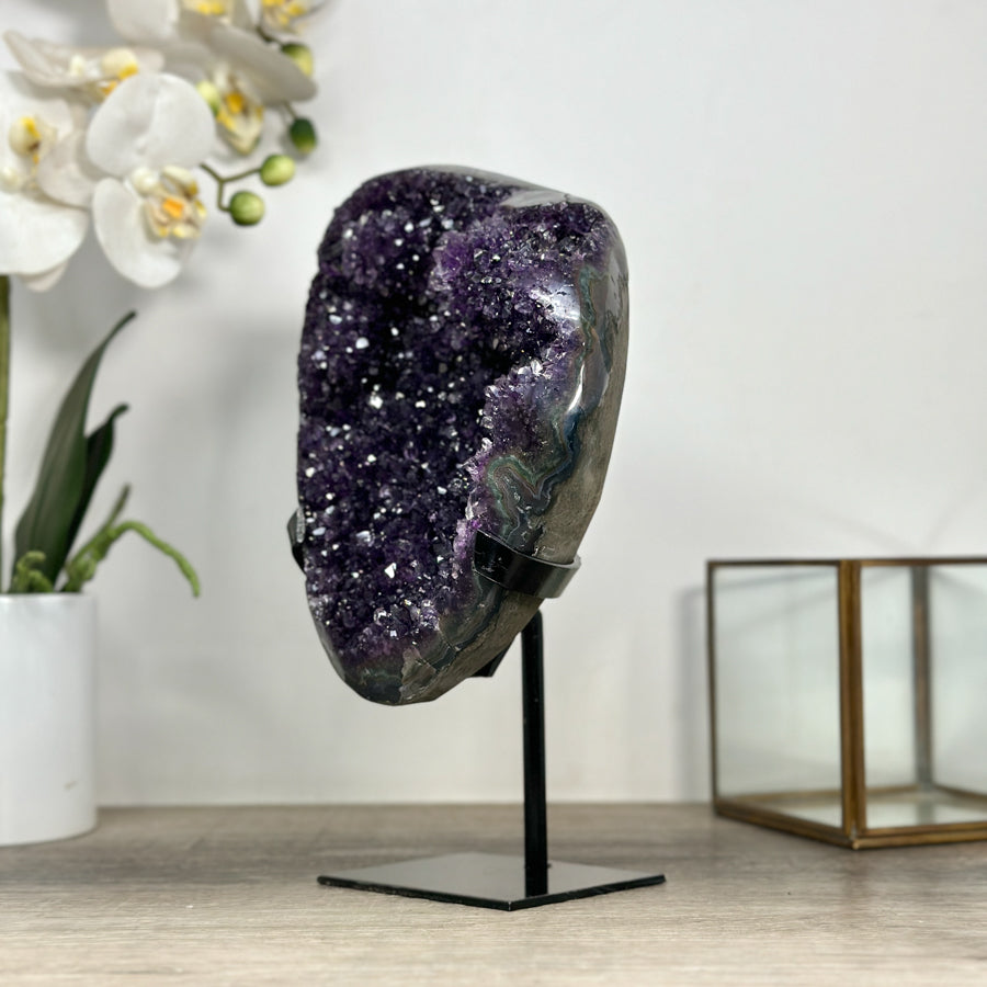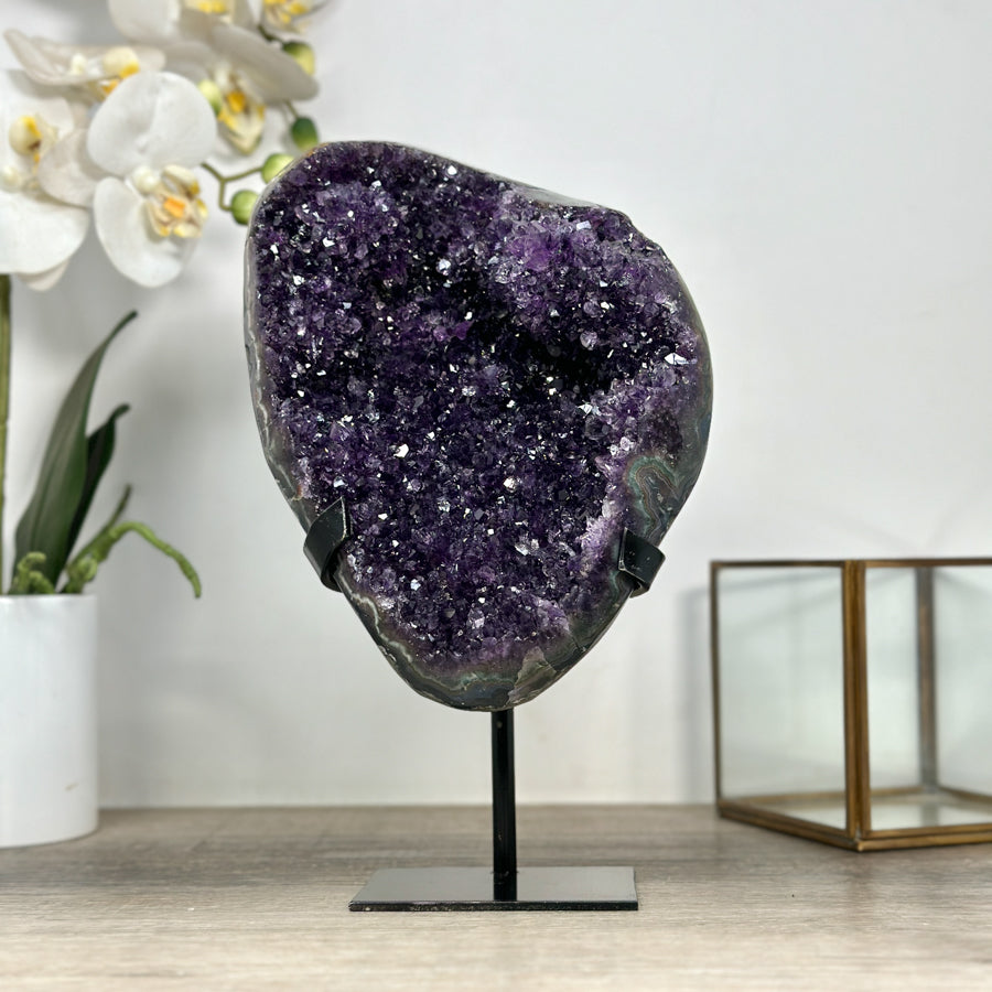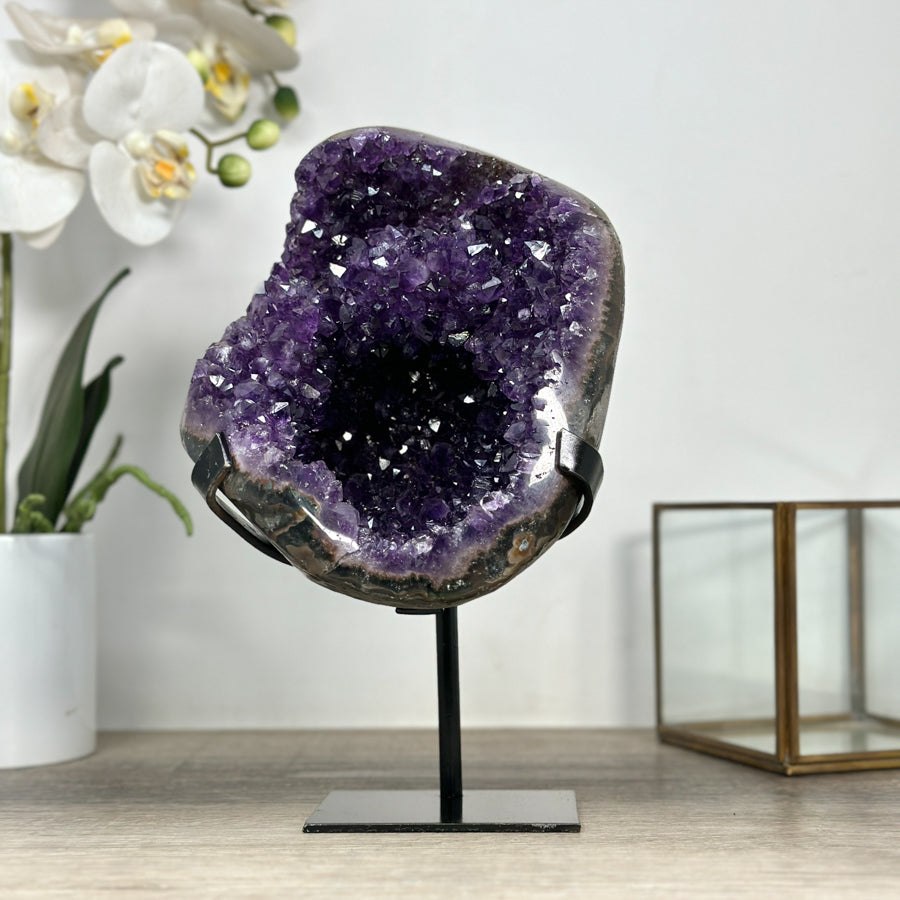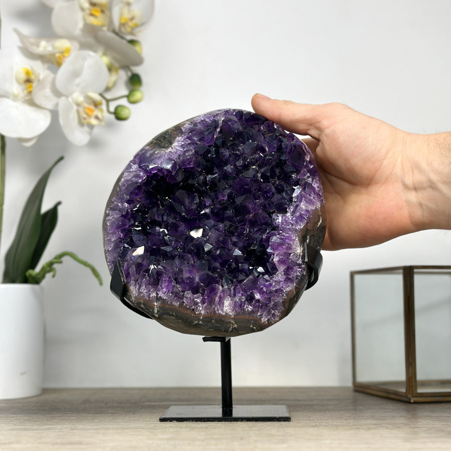 These carefully selected minerals are expertly mounted on handmade metal stands, allowing them to be displayed proudly in any room. With their stunning natural colors and unique characteristics, these mineral pieces will add a touch of elegance and sophistication to any space.