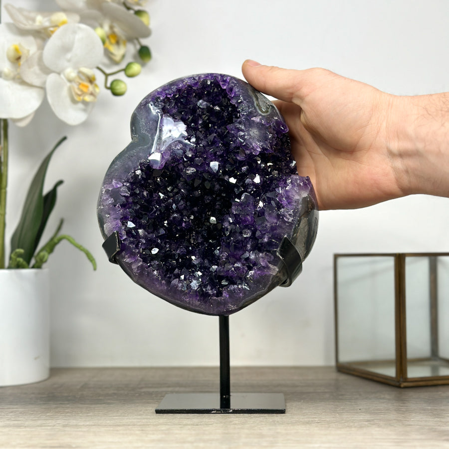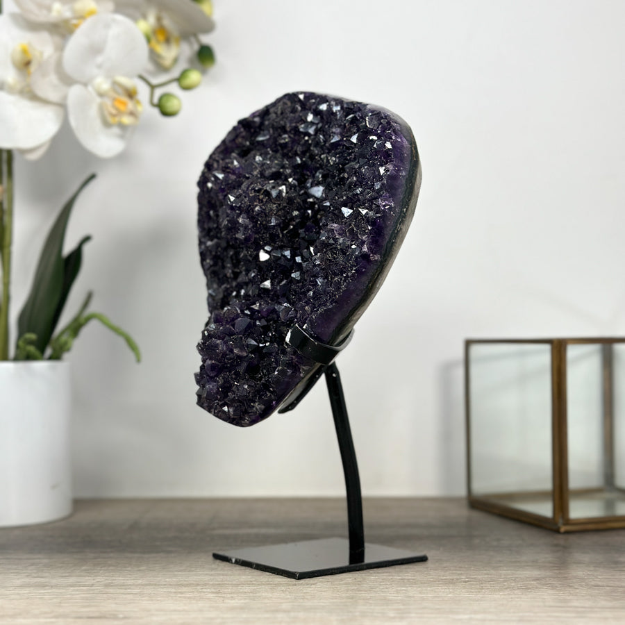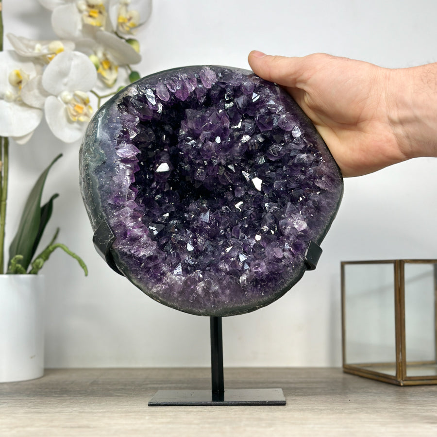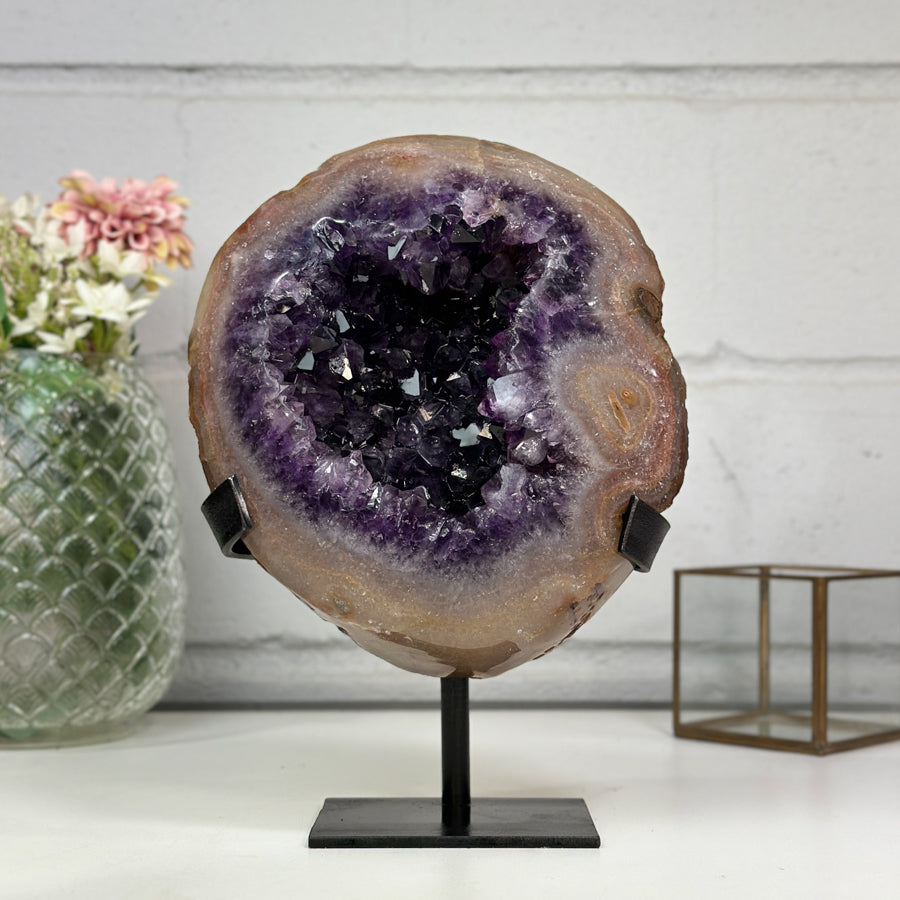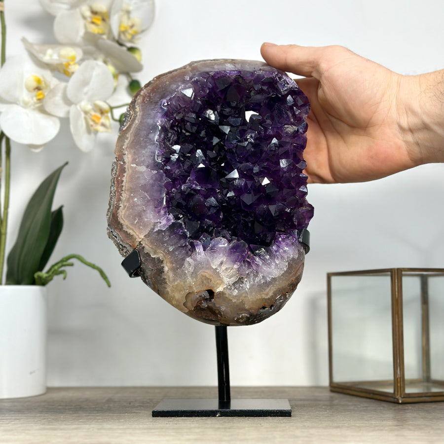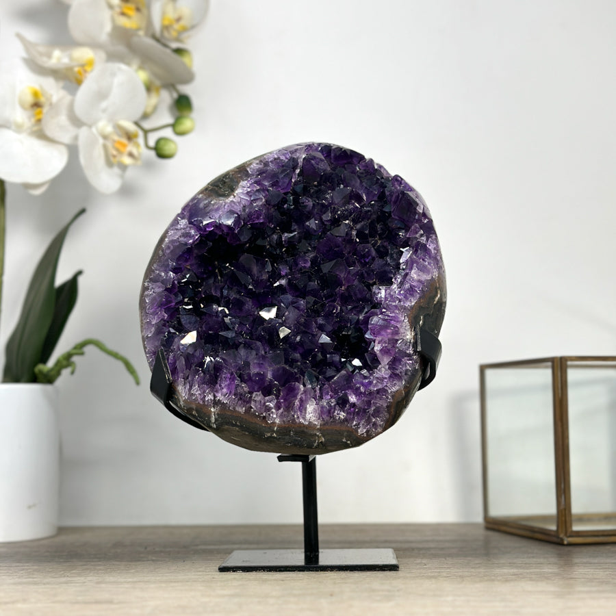 These carefully selected minerals are expertly mounted on handmade metal stands, allowing them to be displayed proudly in any room. With their stunning natural colors and unique characteristics, these mineral pieces will add a touch of elegance and sophistication to any space.