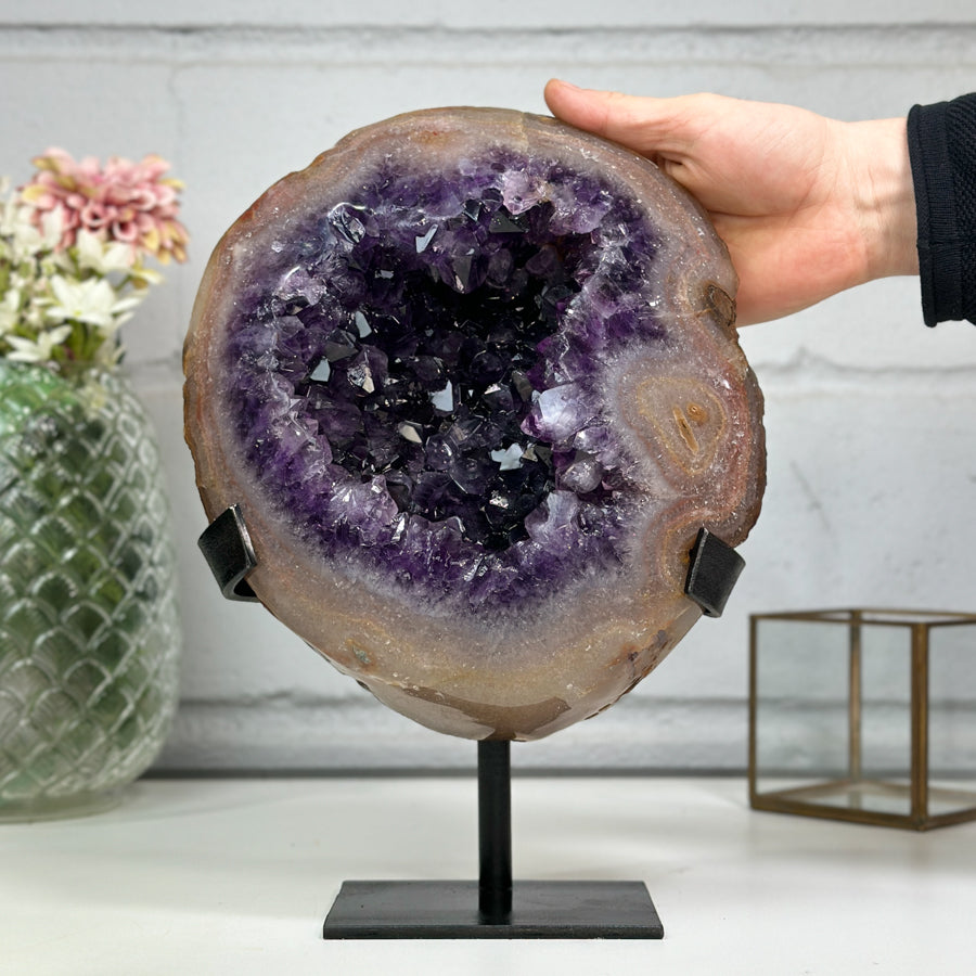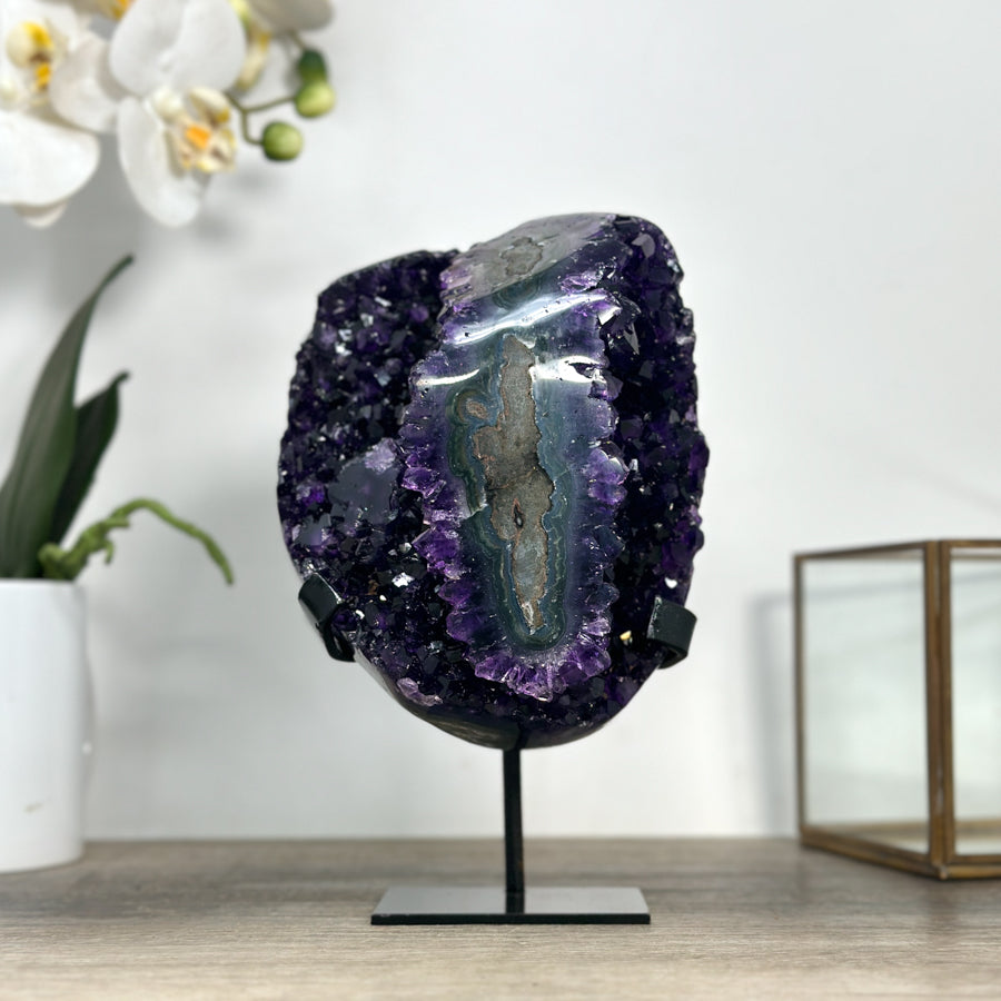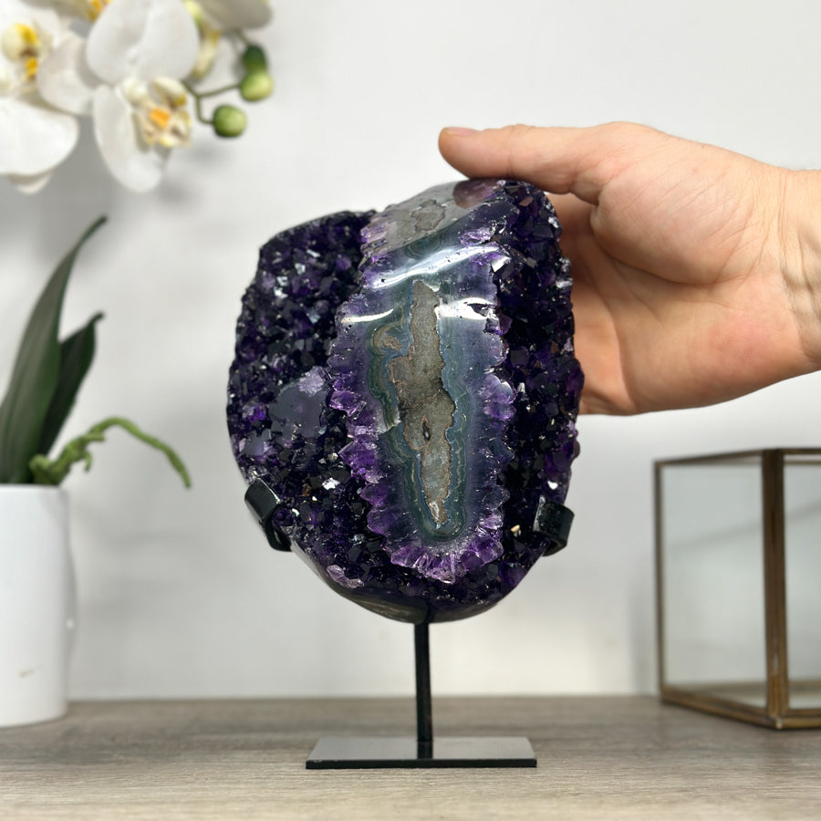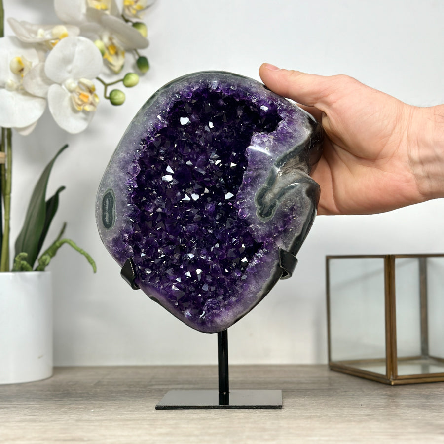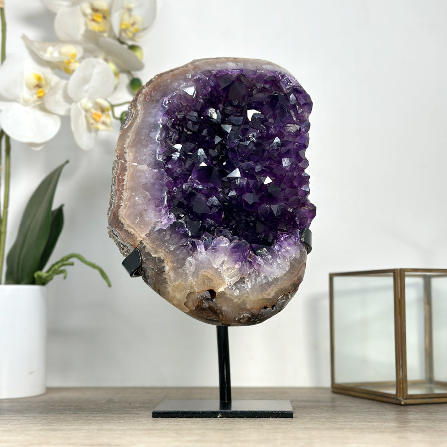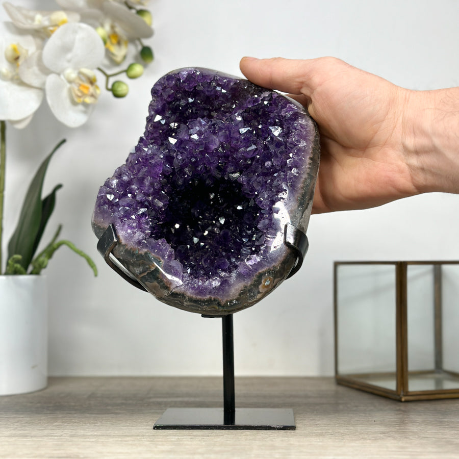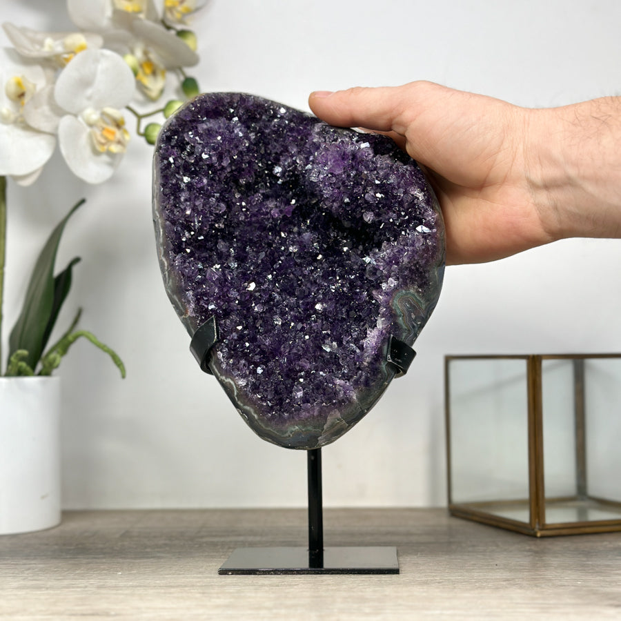 These carefully selected minerals are expertly mounted on handmade metal stands, allowing them to be displayed proudly in any room. With their stunning natural colors and unique characteristics, these mineral pieces will add a touch of elegance and sophistication to any space.