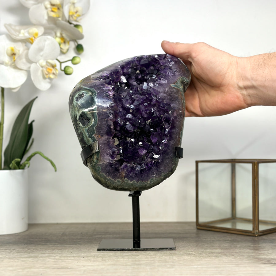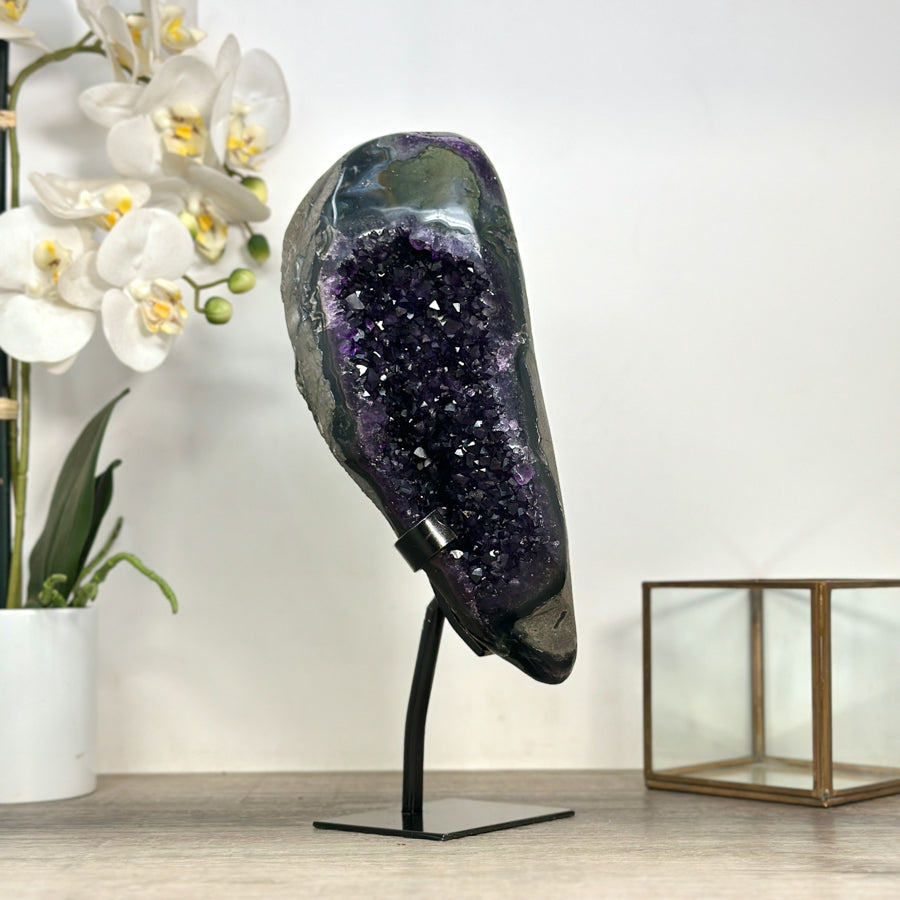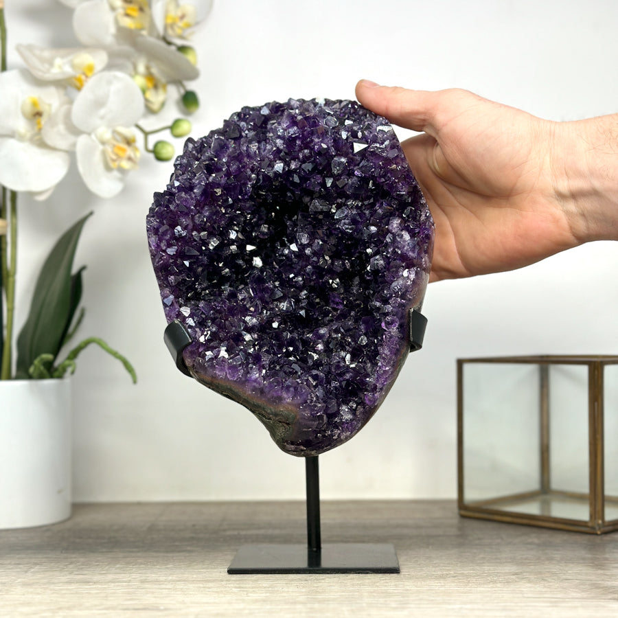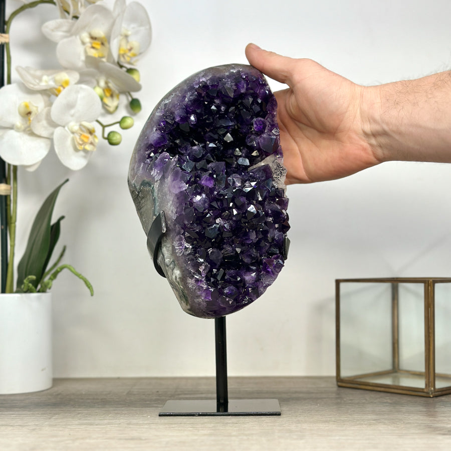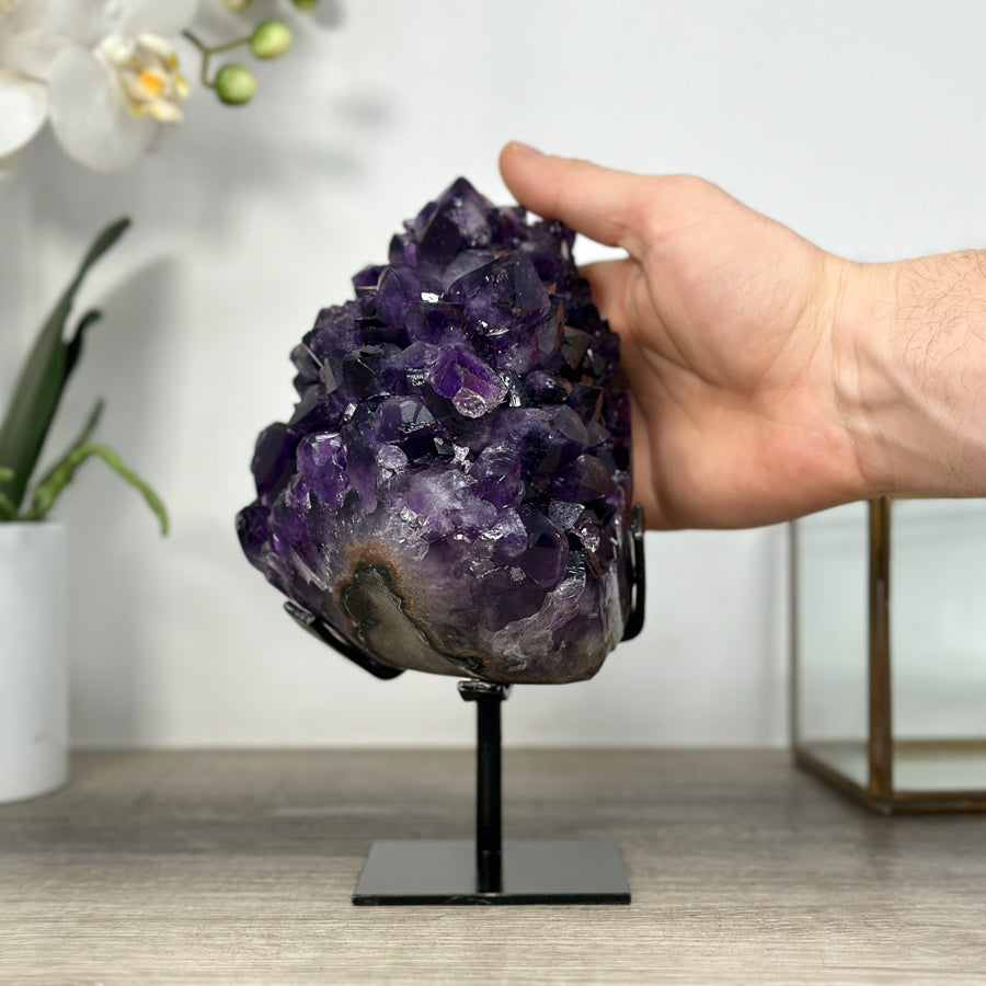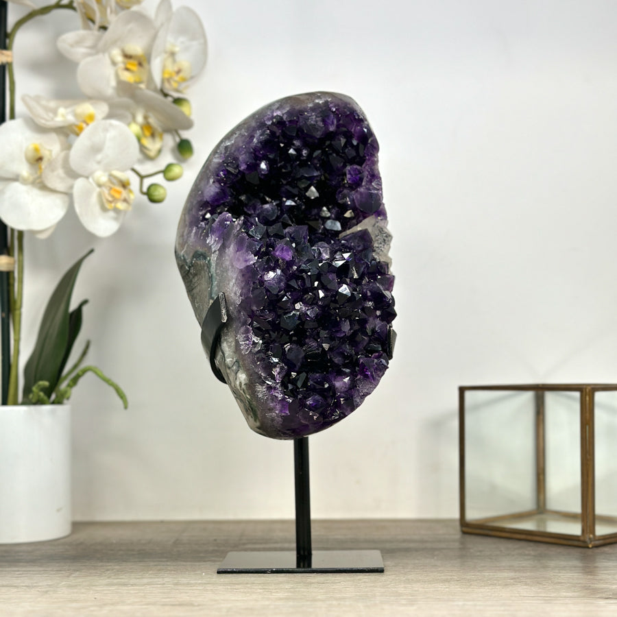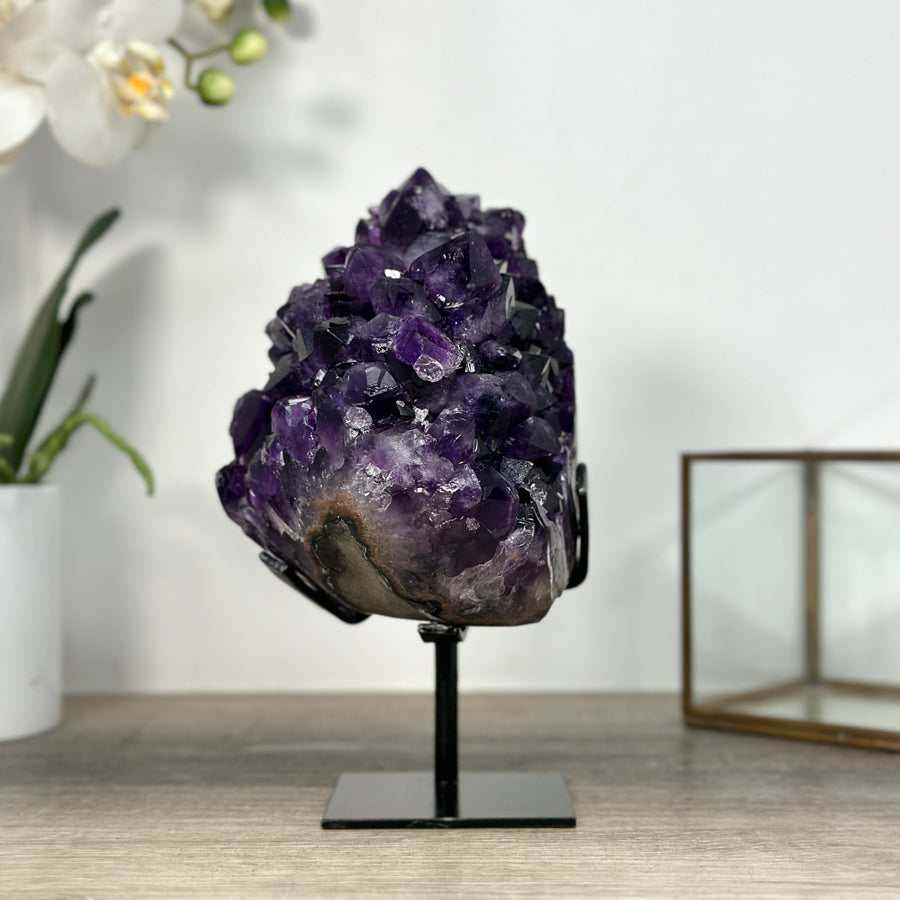 These carefully selected minerals are expertly mounted on handmade metal stands, allowing them to be displayed proudly in any room. With their stunning natural colors and unique characteristics, these mineral pieces will add a touch of elegance and sophistication to any space.