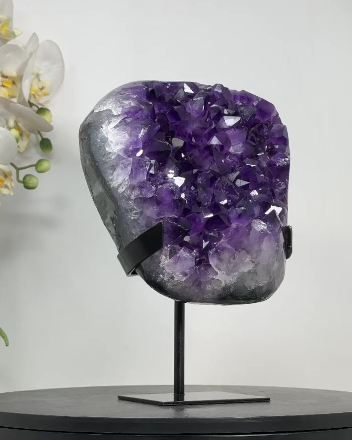 Elevate the ambiance of your home or office with the captivating beauty of our Quartz Specimens. Nestled elegantly on a modern metal display, this stunning piece blends natural elegance with contemporary style, making it a perfect addition to any decor.