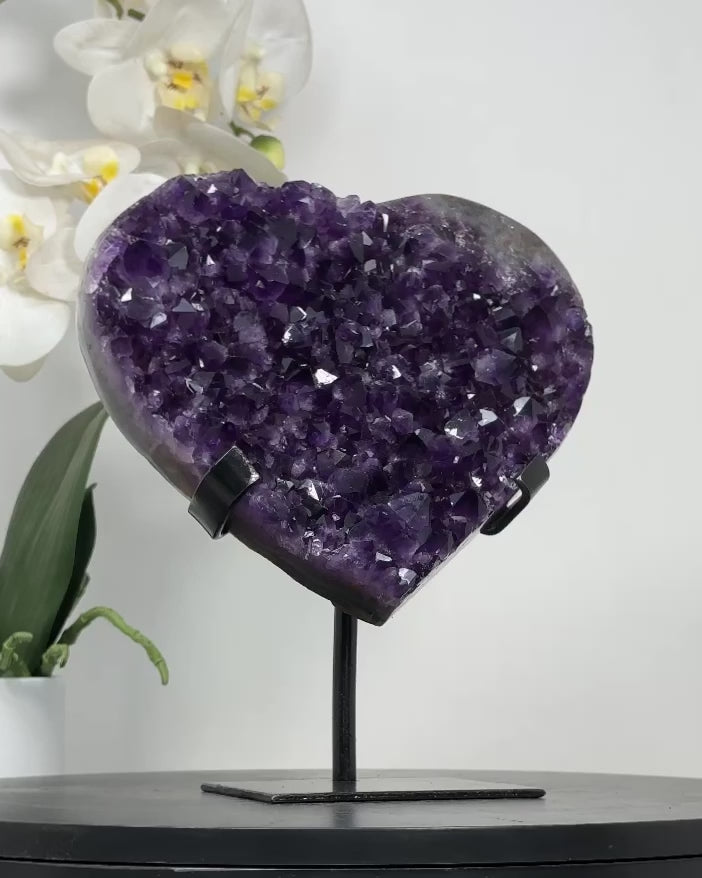 Discover the beauty of our hand-polished heart-shaped minerals, sourced from Uruguay, including Amethysts, Agates, and Quartz. Each piece is meticulously crafted and comes with a custom-made metal stand, adding a touch of elegance to any space.