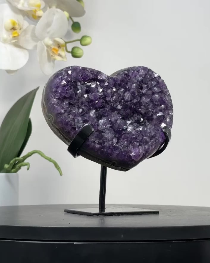 Discover the beauty of our hand-polished heart-shaped minerals, sourced from Uruguay, including Amethysts, Agates, and Quartz. Each piece is meticulously crafted and comes with a custom-made metal stand, adding a touch of elegance to any space.
