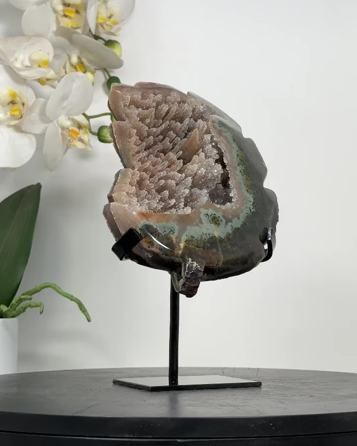 Agate & Quartz Druzy Stone Leaf Carving on Metal Stand - MWS2804