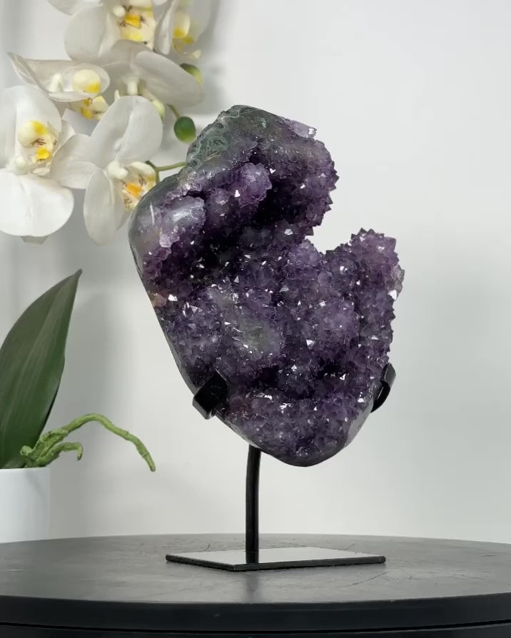 Elevate the ambiance of your home or office with the captivating beauty of our Quartz Specimens. Nestled elegantly on a modern metal display, this stunning piece blends natural elegance with contemporary style, making it a perfect addition to any decor.