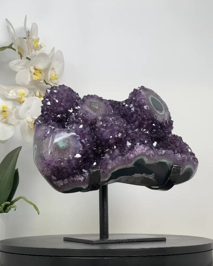 Elevate the ambiance of your home or office with the captivating beauty of our Quartz Specimens. Nestled elegantly on a modern metal display, this stunning piece blends natural elegance with contemporary style, making it a perfect addition to any decor.