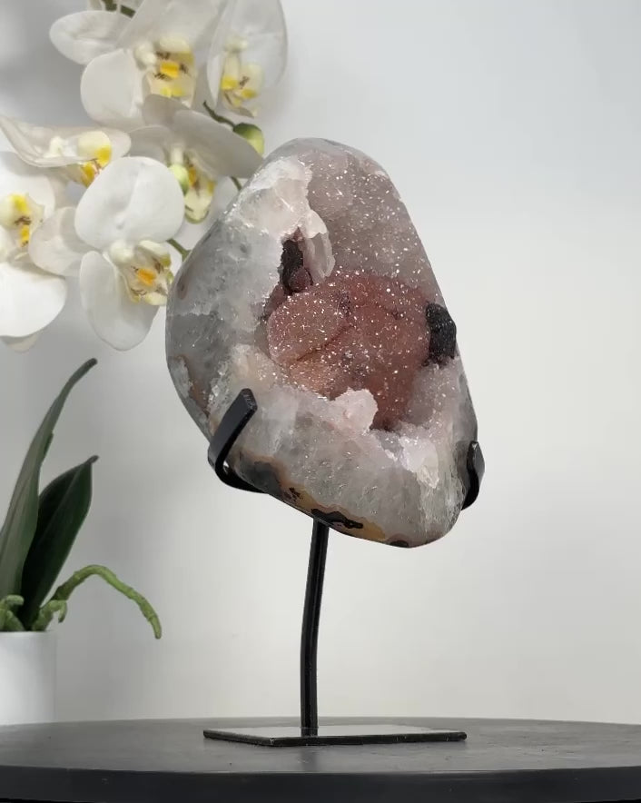 Elevate the ambiance of your home or office with the captivating beauty of our Quartz Specimens. Nestled elegantly on a modern metal display, this stunning piece blends natural elegance with contemporary style, making it a perfect addition to any decor.