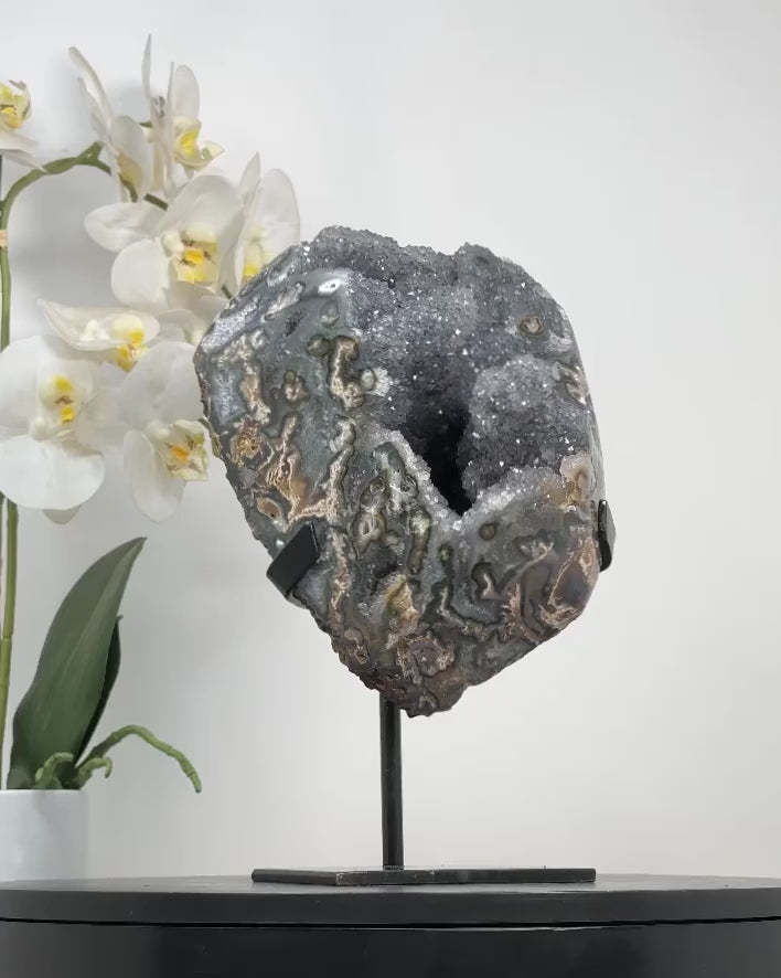 Elevate the ambiance of your home or office with the captivating beauty of our Quartz Specimens. Nestled elegantly on a modern metal display, this stunning piece blends natural elegance with contemporary style, making it a perfect addition to any decor.