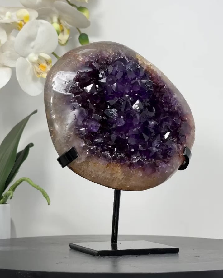 Elevate the ambiance of your home or office with the captivating beauty of our Quartz Specimens. Nestled elegantly on a modern metal display, this stunning piece blends natural elegance with contemporary style, making it a perfect addition to any decor.