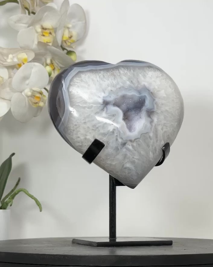 Discover the beauty of our hand-polished heart-shaped minerals, sourced from Uruguay, including Amethysts, Agates, and Quartz. Each piece is meticulously crafted and comes with a custom-made metal stand, adding a touch of elegance to any space.