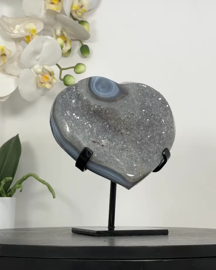 Discover the beauty of our hand-polished heart-shaped minerals, sourced from Uruguay, including Amethysts, Agates, and Quartz. Each piece is meticulously crafted and comes with a custom-made metal stand, adding a touch of elegance to any space.