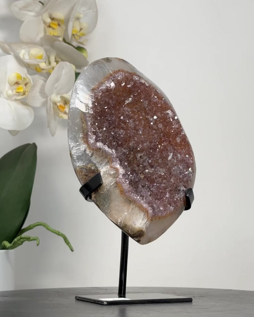 Caramel Tone Quartz Geode on Metal Stand – Natural Crystal Statement Piece from Uruguay - MWS2418
