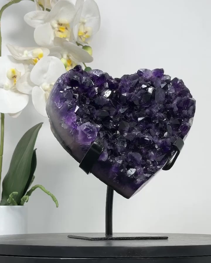 Discover the beauty of our hand-polished heart-shaped minerals, sourced from Uruguay, including Amethysts, Agates, and Quartz. Each piece is meticulously crafted and comes with a custom-made metal stand, adding a touch of elegance to any space.