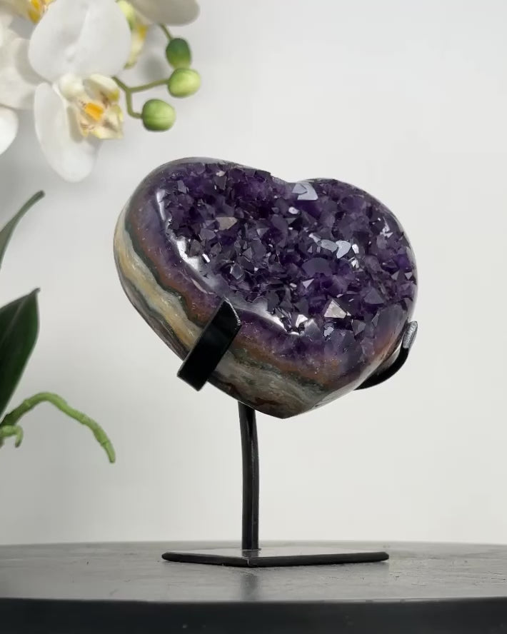 Discover the beauty of our hand-polished heart-shaped minerals, sourced from Uruguay, including Amethysts, Agates, and Quartz. Each piece is meticulously crafted and comes with a custom-made metal stand, adding a touch of elegance to any space.