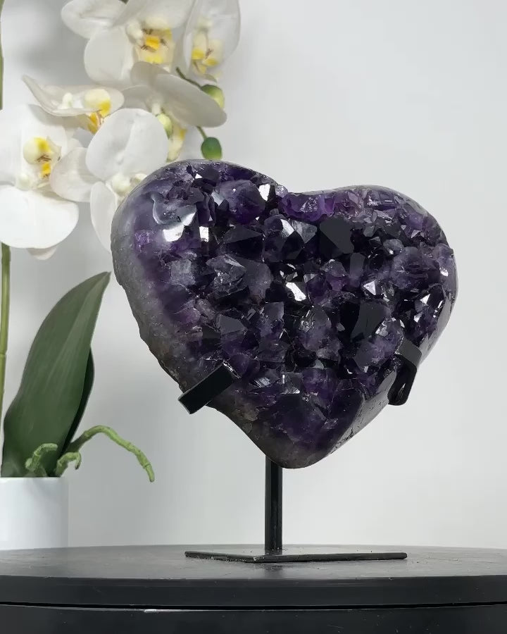 Discover the beauty of our hand-polished heart-shaped minerals, sourced from Uruguay, including Amethysts, Agates, and Quartz. Each piece is meticulously crafted and comes with a custom-made metal stand, adding a touch of elegance to any space.