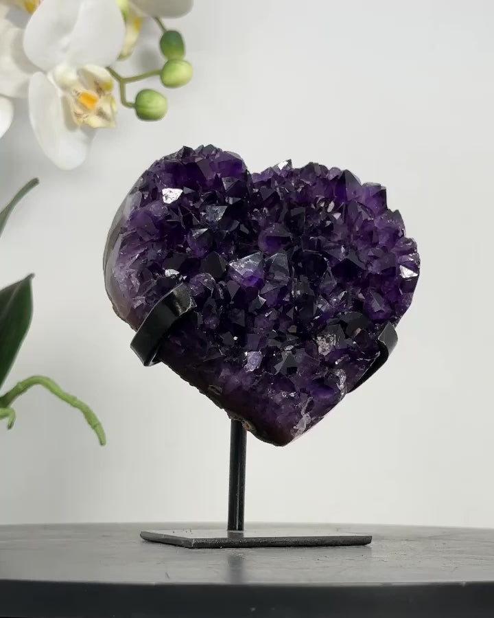Discover the beauty of our hand-polished heart-shaped minerals, sourced from Uruguay, including Amethysts, Agates, and Quartz. Each piece is meticulously crafted and comes with a custom-made metal stand, adding a touch of elegance to any space.
