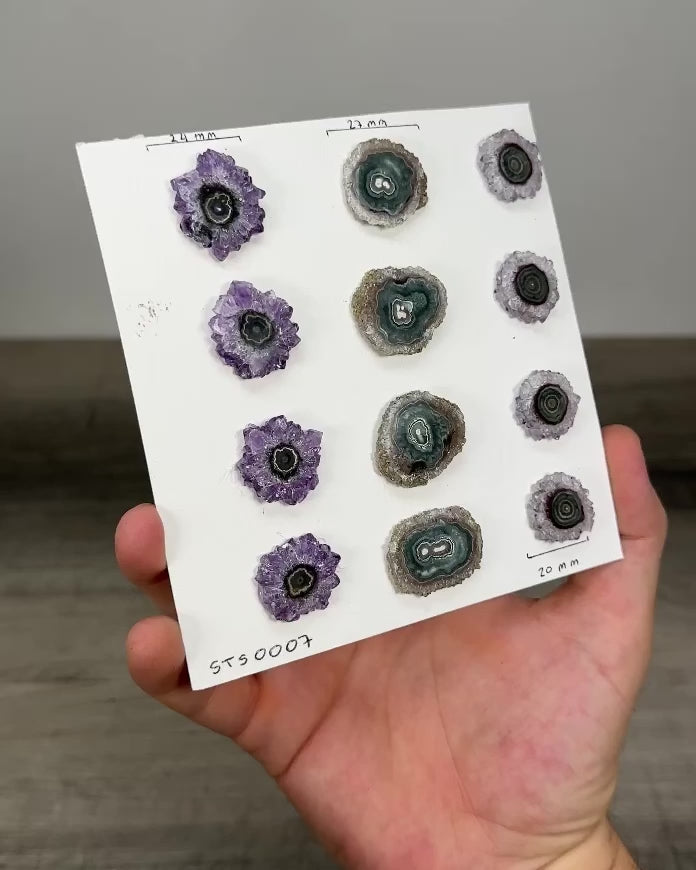 Discover the natural beauty of our mixed stalactite slice flats, expertly crafted from Amethyst, Quartz, Agate, and Jasper Stalactites sourced from the famed "Don Camilo" mine in Artigas, Uruguay. Each flat contains a unique assortment of slices. — Perfect for creating one-of-a-kind jewelry pieces.