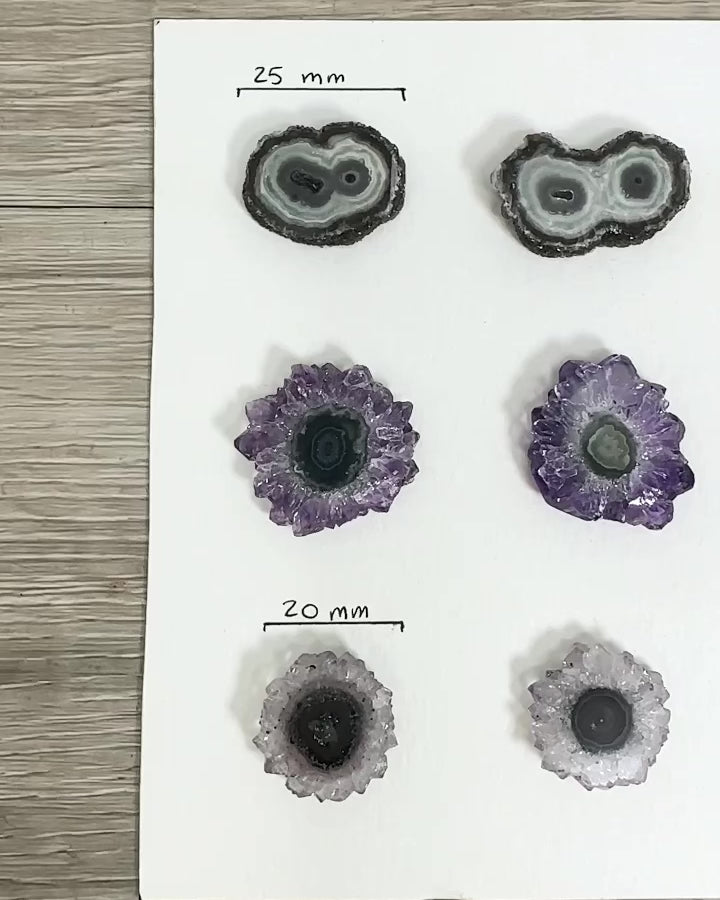 Discover the natural beauty of our mixed stalactite slice flats, expertly crafted from Amethyst, Quartz, Agate, and Jasper Stalactites sourced from the famed "Don Camilo" mine in Artigas, Uruguay. Each flat contains a unique assortment of slices. — Perfect for creating one-of-a-kind jewelry pieces.