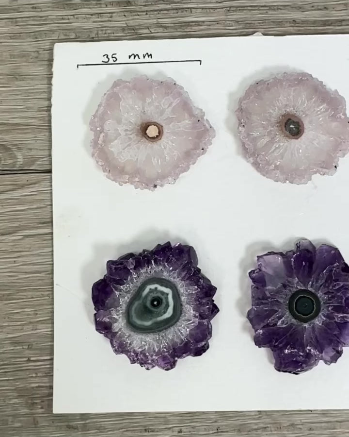 Discover the natural beauty of our mixed stalactite slice flats, expertly crafted from Amethyst, Quartz, Agate, and Jasper Stalactites sourced from the famed "Don Camilo" mine in Artigas, Uruguay. Each flat contains a unique assortment of slices. — Perfect for creating one-of-a-kind jewelry pieces.