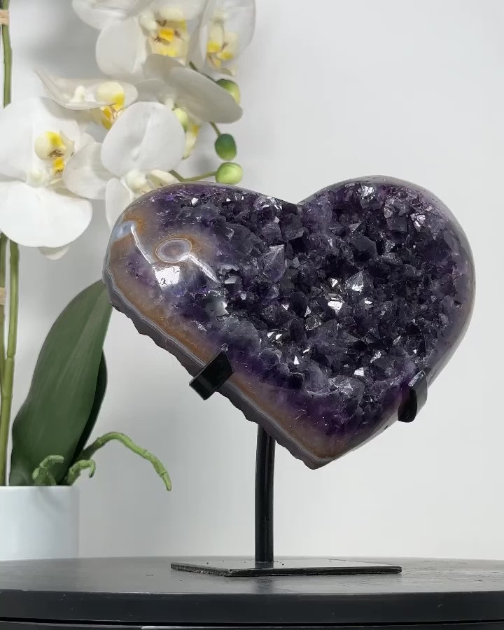 Discover the beauty of our hand-polished heart-shaped minerals, sourced from Uruguay, including Amethysts, Agates, and Quartz. Each piece is meticulously crafted and comes with a custom-made metal stand, adding a touch of elegance to any space.