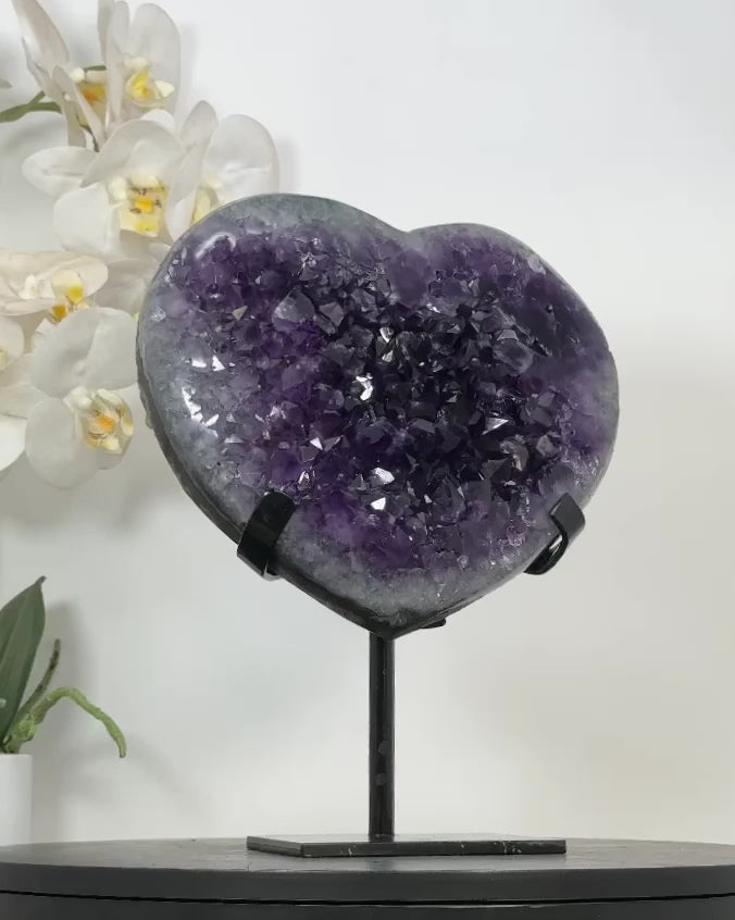 Discover the beauty of our hand-polished heart-shaped minerals, sourced from Uruguay, including Amethysts, Agates, and Quartz. Each piece is meticulously crafted and comes with a custom-made metal stand, adding a touch of elegance to any space.