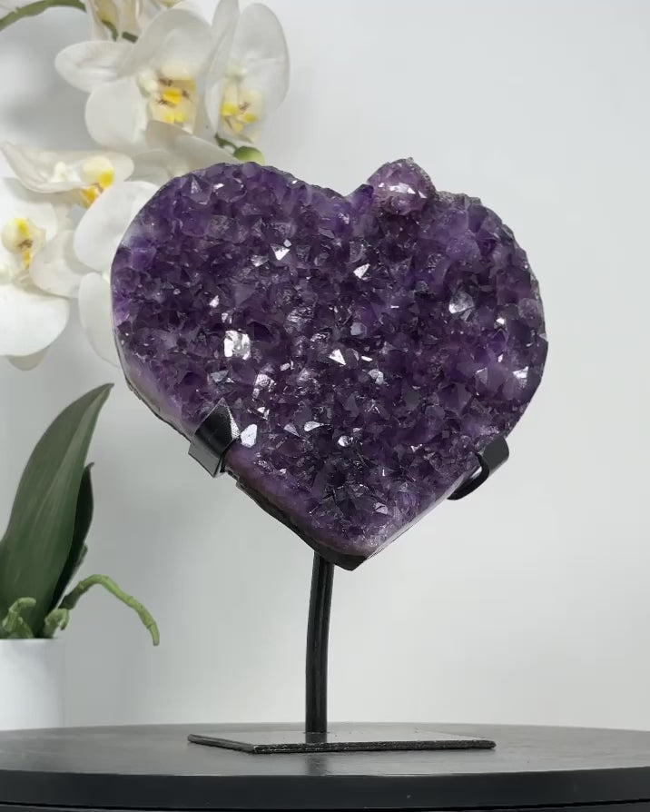 Discover the beauty of our hand-polished heart-shaped minerals, sourced from Uruguay, including Amethysts, Agates, and Quartz. Each piece is meticulously crafted and comes with a custom-made metal stand, adding a touch of elegance to any space.