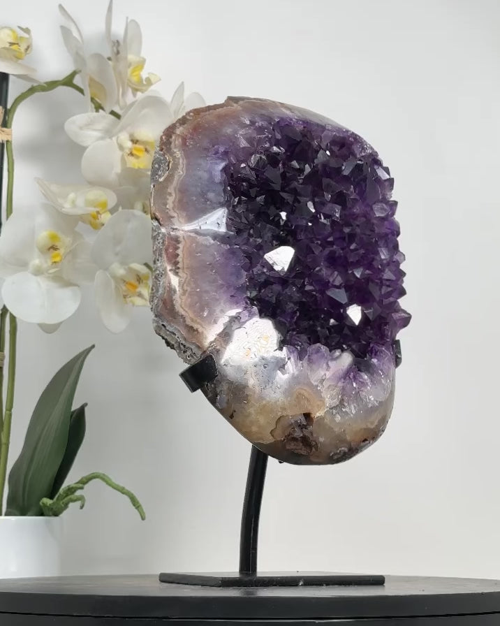 Elevate the ambiance of your home or office with the captivating beauty of our Quartz Specimens. Nestled elegantly on a modern metal display, this stunning piece blends natural elegance with contemporary style, making it a perfect addition to any decor.