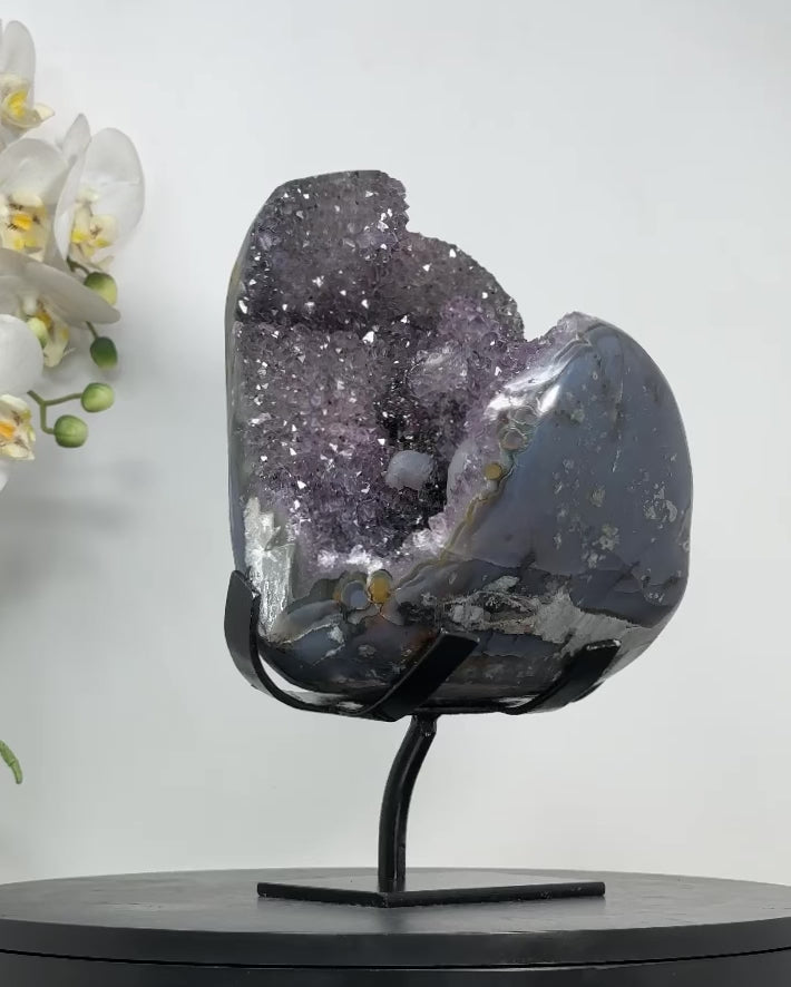 Elevate the ambiance of your home or office with the captivating beauty of our Quartz Specimens. Nestled elegantly on a modern metal display, this stunning piece blends natural elegance with contemporary style, making it a perfect addition to any decor.