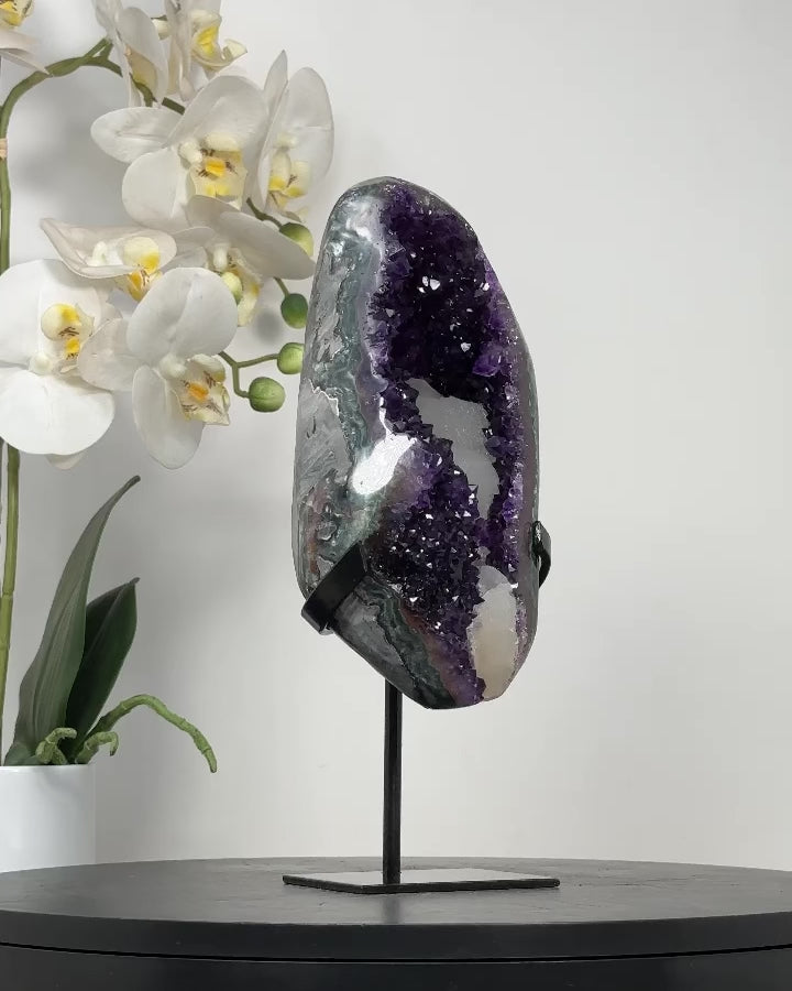 Elevate the ambiance of your home or office with the captivating beauty of our Quartz Specimens. Nestled elegantly on a modern metal display, this stunning piece blends natural elegance with contemporary style, making it a perfect addition to any decor.