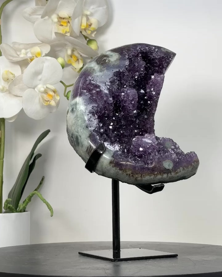 Elevate the ambiance of your home or office with the captivating beauty of our Quartz Specimens. Nestled elegantly on a modern metal display, this stunning piece blends natural elegance with contemporary style, making it a perfect addition to any decor.