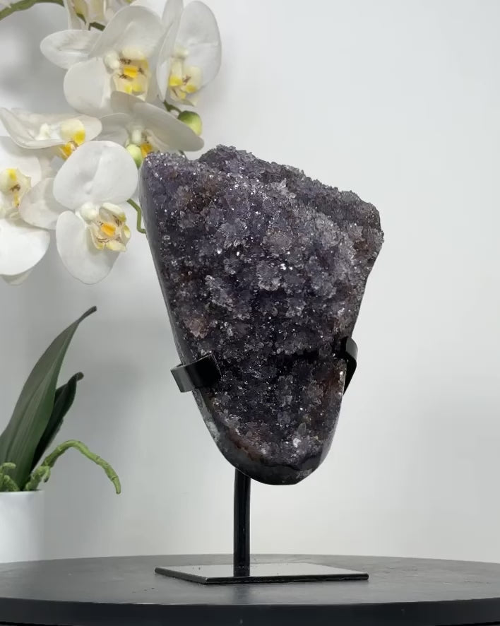 Elevate the ambiance of your home or office with the captivating beauty of our Quartz Specimens. Nestled elegantly on a modern metal display, this stunning piece blends natural elegance with contemporary style, making it a perfect addition to any decor.