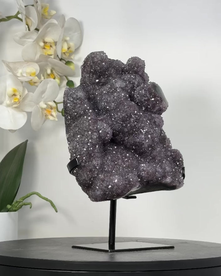 Elevate the ambiance of your home or office with the captivating beauty of our Quartz Specimens. Nestled elegantly on a modern metal display, this stunning piece blends natural elegance with contemporary style, making it a perfect addition to any decor.