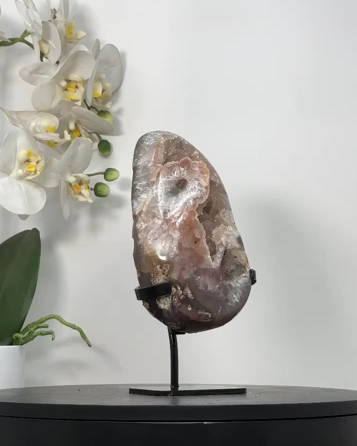 Elevate the ambiance of your home or office with the captivating beauty of our Quartz Specimens. Nestled elegantly on a modern metal display, this stunning piece blends natural elegance with contemporary style, making it a perfect addition to any decor.