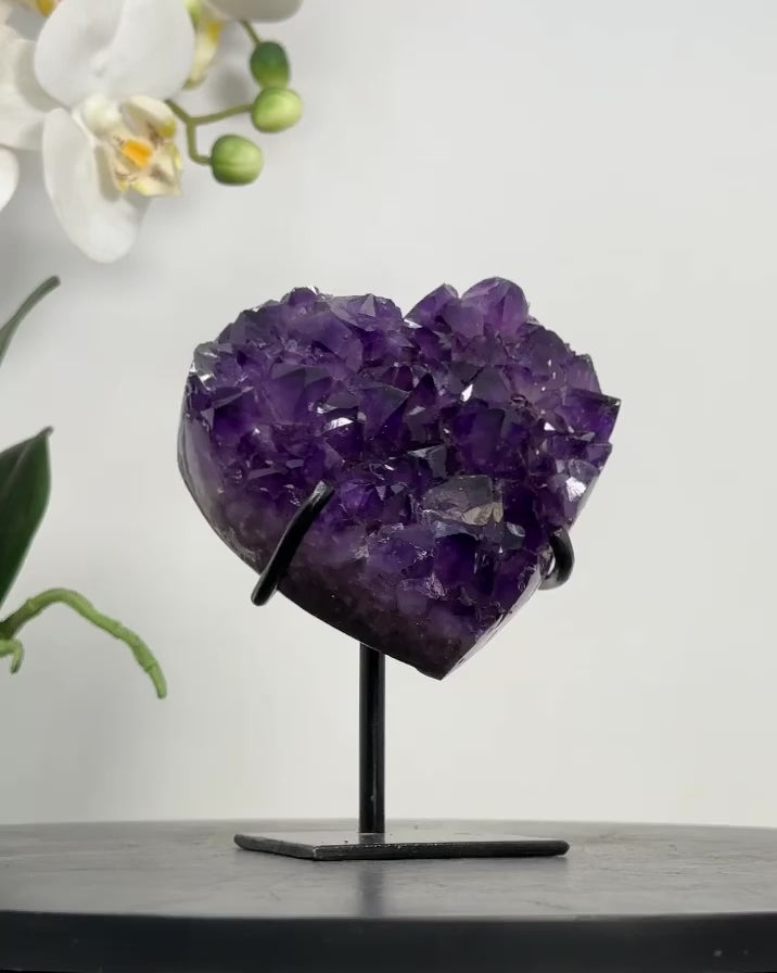 Discover the beauty of our hand-polished heart-shaped minerals, sourced from Uruguay, including Amethysts, Agates, and Quartz. Each piece is meticulously crafted and comes with a custom-made metal stand, adding a touch of elegance to any space.