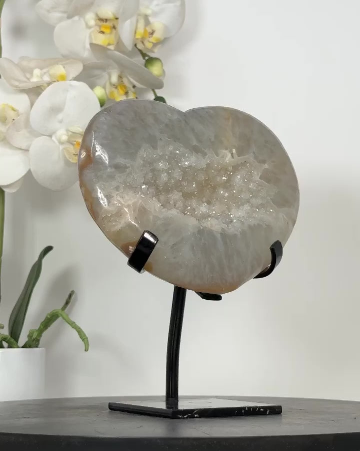 Discover the beauty of our hand-polished heart-shaped minerals, sourced from Uruguay, including Amethysts, Agates, and Quartz. Each piece is meticulously crafted and comes with a custom-made metal stand, adding a touch of elegance to any space.