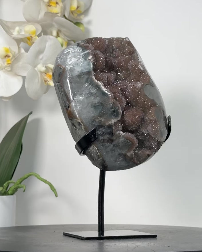 Elevate the ambiance of your home or office with the captivating beauty of our Quartz Specimens. Nestled elegantly on a modern metal display, this stunning piece blends natural elegance with contemporary style, making it a perfect addition to any decor.