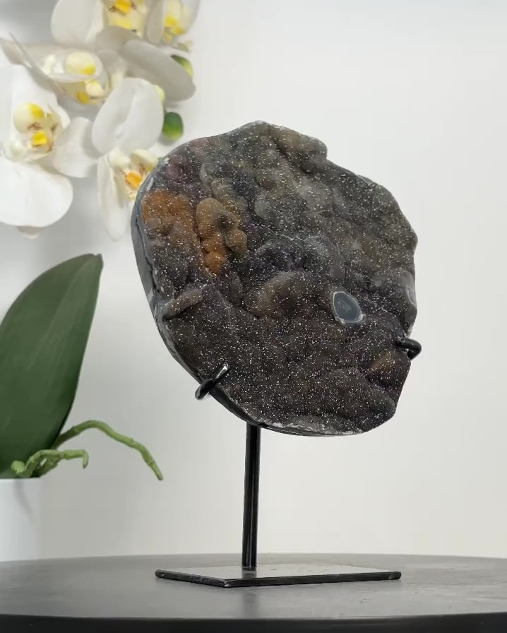 Elevate the ambiance of your home or office with the captivating beauty of our Quartz Specimens. Nestled elegantly on a modern metal display, this stunning piece blends natural elegance with contemporary style, making it a perfect addition to any decor.