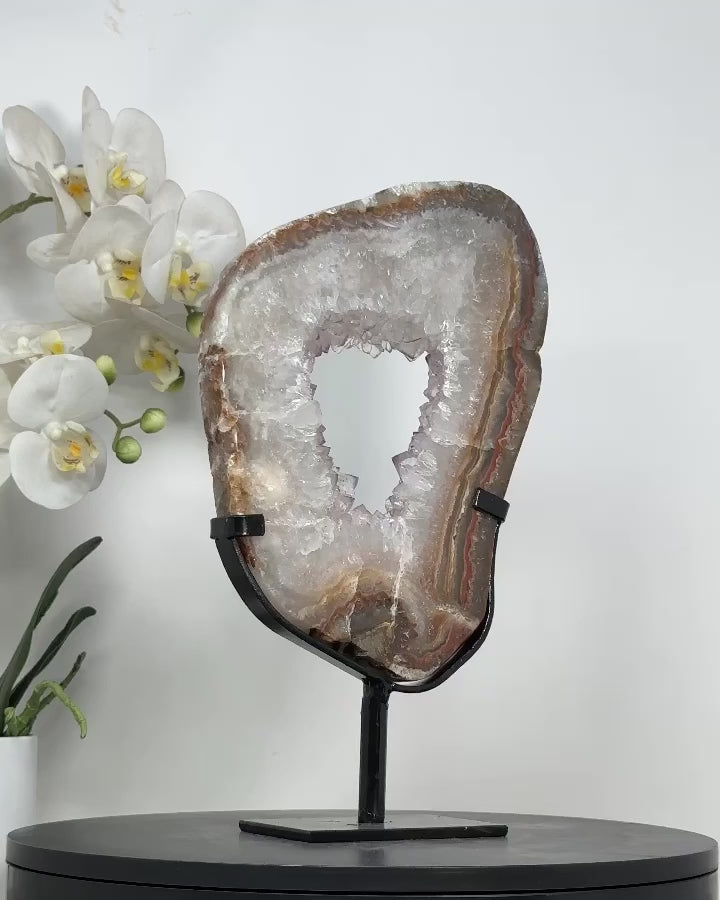 Elevate the ambiance of your home or office with the captivating beauty of our Quartz Specimens. Nestled elegantly on a modern metal display, this stunning piece blends natural elegance with contemporary style, making it a perfect addition to any decor.