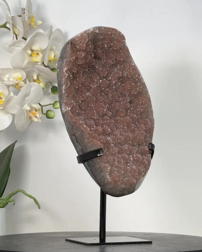 Elevate the ambiance of your home or office with the captivating beauty of our Quartz Specimens. Nestled elegantly on a modern metal display, this stunning piece blends natural elegance with contemporary style, making it a perfect addition to any decor.