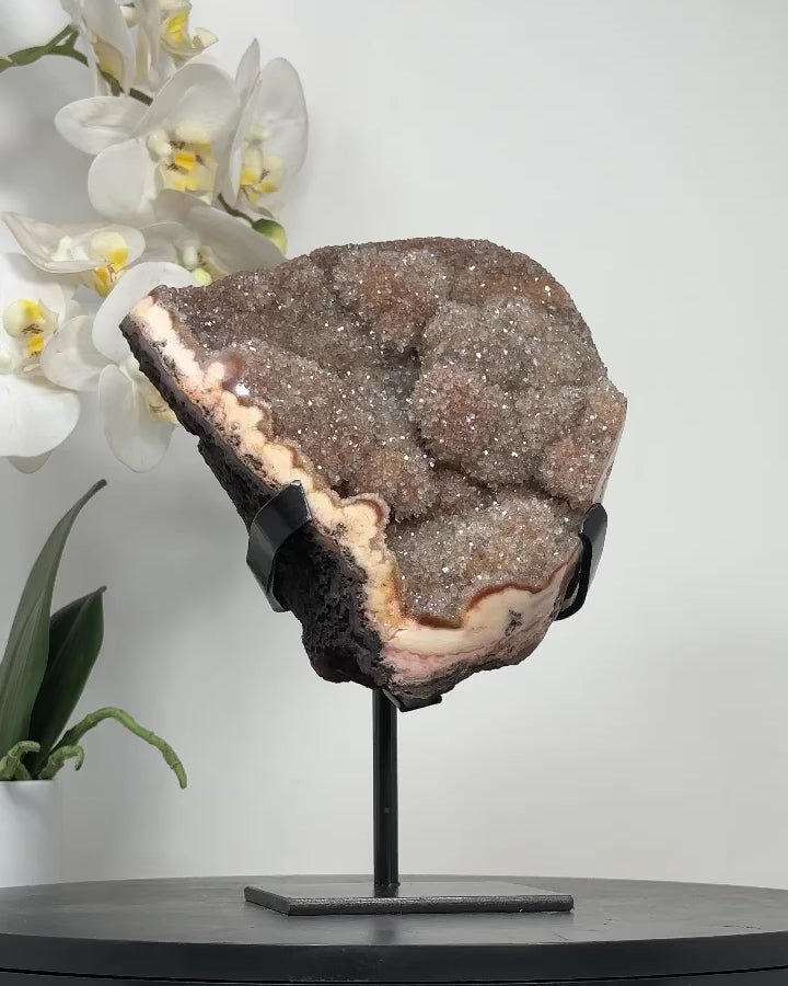 Elevate the ambiance of your home or office with the captivating beauty of our Quartz Specimens. Nestled elegantly on a modern metal display, this stunning piece blends natural elegance with contemporary style, making it a perfect addition to any decor.