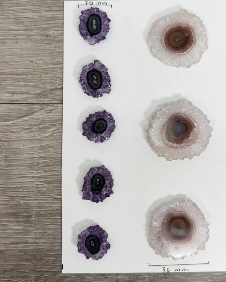 Discover the natural beauty of our mixed stalactite slice flats, expertly crafted from Amethyst, Quartz, Agate, and Jasper Stalactites sourced from the famed "Don Camilo" mine in Artigas, Uruguay. Each flat contains a unique assortment of slices. — Perfect for creating one-of-a-kind jewelry pieces.