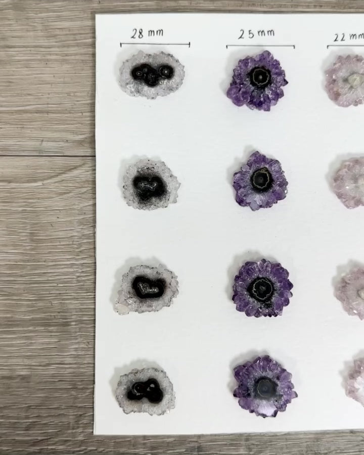 Discover the natural beauty of our mixed stalactite slice flats, expertly crafted from Amethyst, Quartz, Agate, and Jasper Stalactites sourced from the famed "Don Camilo" mine in Artigas, Uruguay. Each flat contains a unique assortment of slices. — Perfect for creating one-of-a-kind jewelry pieces.
