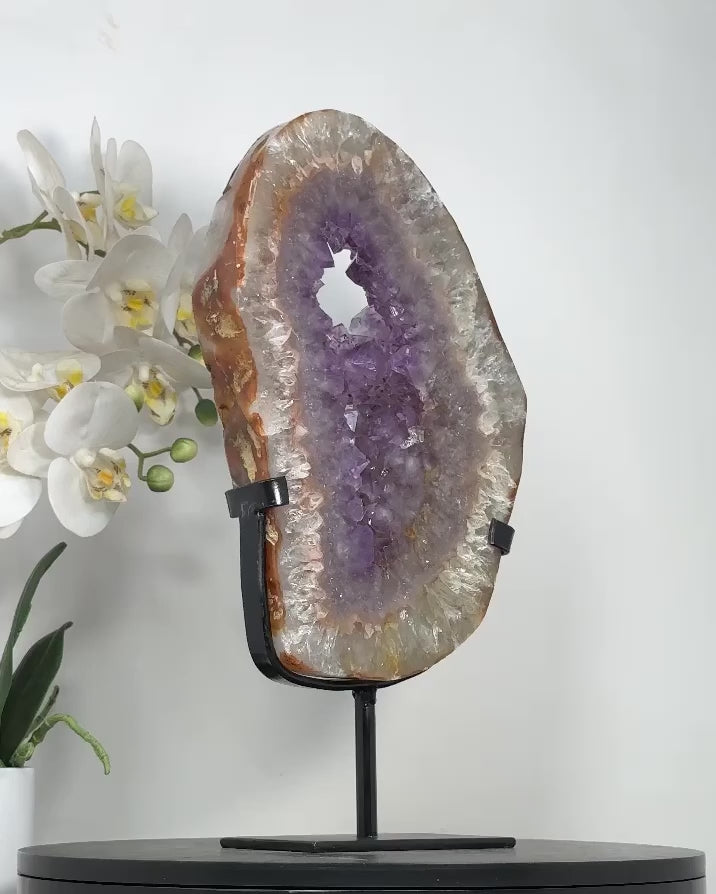 Explore the enchanting world of Uruguay's finest minerals with our unique collection of hand-polished specimens. Each piece is meticulously crafted and accompanied by a custom-made metal stand, enhancing its natural beauty and elegance.